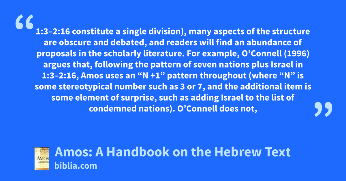 1:3–2:16 constitute a single division), many aspects of the structure are obscure and debated, and readers will find an abundance of proposals in the scholarly literature. For example, O’Connell (1996) argues that, following the pattern of seven nations plus Israel in 1:3–2:16, Amos uses an “N +1” pattern throughout (where “N” is some stereotypical number such as 3 or 7, and the additional item is some element of surprise, such as adding Israel to the list of condemned nations). O’Connell does not,