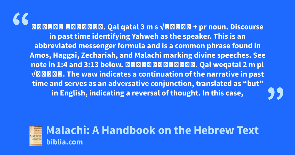 אָמַ֣ר יְהוָ֔ה. Qal qatal 3 m s √אָמַר + pr noun. Discourse in past time identifying Yahweh as the speaker. This is an abbreviated messenger formula and is a common phrase found in Amos, Haggai, Zechariah, and Malachi marking divine speeches. See note in 1:4 and 3:13 below. וַאֲמַרְתֶּ֖ם. Qal weqatal 2 m pl √אָמַר. The waw indicates a continuation of the narrative in past time and serves as an adversative conjunction, translated as “but” in English, indicating a reversal of thought. In this case,