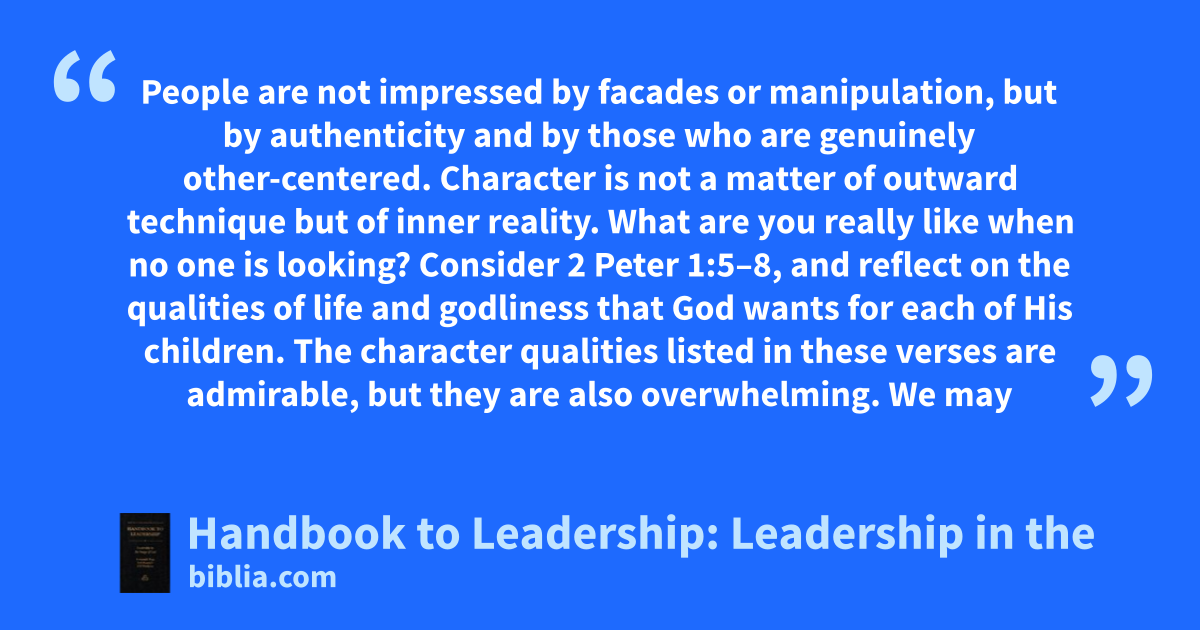 People are not impressed by facades or manipulation, but by authenticity and by those who are genuinely other-centered. Character is not a matter of outward technique but of inner reality. What are you really like when no one is looking? Consider 2 Peter 1:5–8, and reflect on the qualities of life and godliness that God wants for each of His children. The character qualities listed in these verses are admirable, but they are also overwhelming. We may