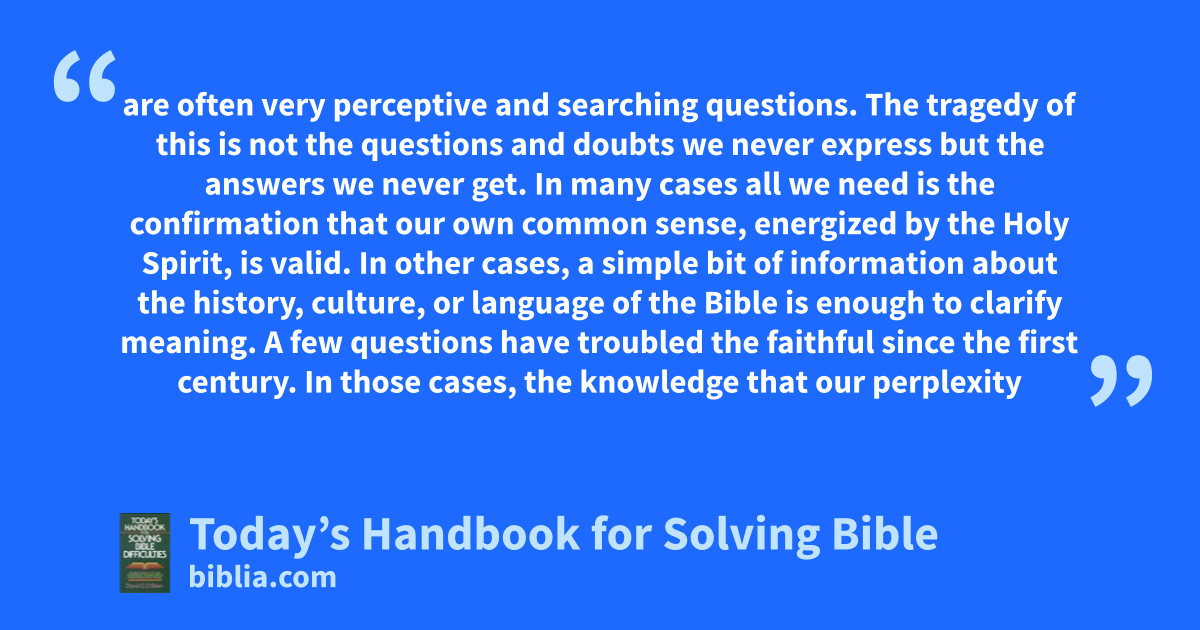are often very perceptive and searching questions. The tragedy of this is not the questions and doubts we never express but the answers we never get. In many cases all we need is the confirmation that our own common sense, energized by the Holy Spirit, is valid. In other cases, a simple bit of information about the history, culture, or language of the Bible is enough to clarify meaning. A few questions have troubled the faithful since the first century. In those cases, the knowledge that our perplexity