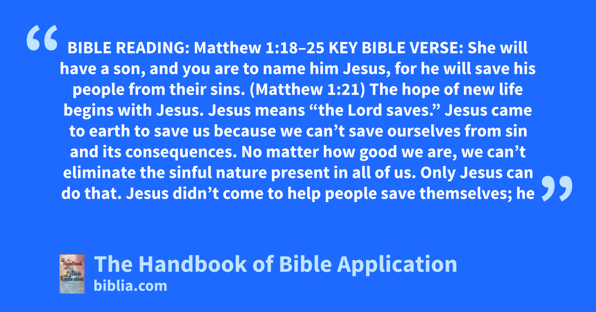 BIBLE READING: Matthew 1:18–25 KEY BIBLE VERSE: She will have a son, and you are to name him Jesus, for he will save his people from their sins. (Matthew 1:21) The hope of new life begins with Jesus. Jesus means “the Lord saves.” Jesus came to earth to save us because we can’t save ourselves from sin and its consequences. No matter how good we are, we can’t eliminate the sinful nature present in all of us. Only Jesus can do that. Jesus didn’t come to help people save themselves; he