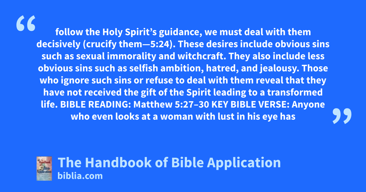 follow the Holy Spirit’s guidance, we must deal with them decisively (crucify them—5:24). These desires include obvious sins such as sexual immorality and witchcraft. They also include less obvious sins such as selfish ambition, hatred, and jealousy. Those who ignore such sins or refuse to deal with them reveal that they have not received the gift of the Spirit leading to a transformed life. BIBLE READING: Matthew 5:27–30 KEY BIBLE VERSE: Anyone who even looks at a woman with lust in his eye has