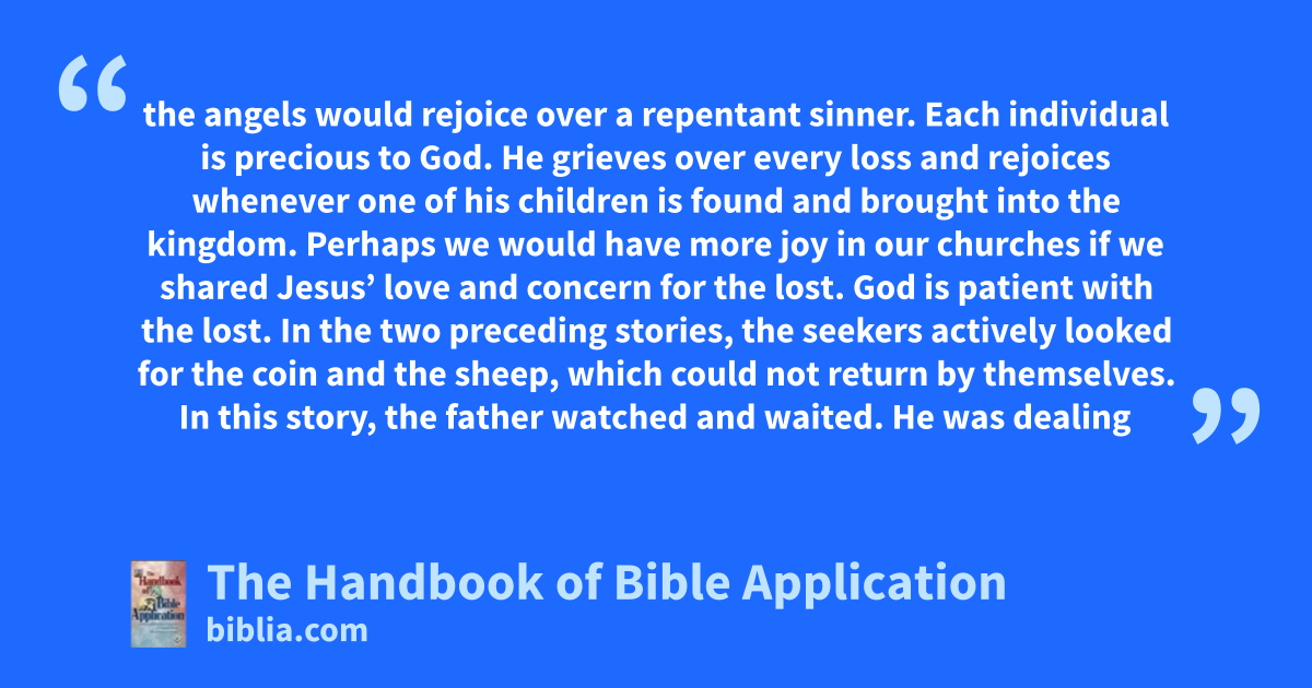 the angels would rejoice over a repentant sinner. Each individual is precious to God. He grieves over every loss and rejoices whenever one of his children is found and brought into the kingdom. Perhaps we would have more joy in our churches if we shared Jesus’ love and concern for the lost. God is patient with the lost. In the two preceding stories, the seekers actively looked for the coin and the sheep, which could not return by themselves. In this story, the father watched and waited. He was dealing