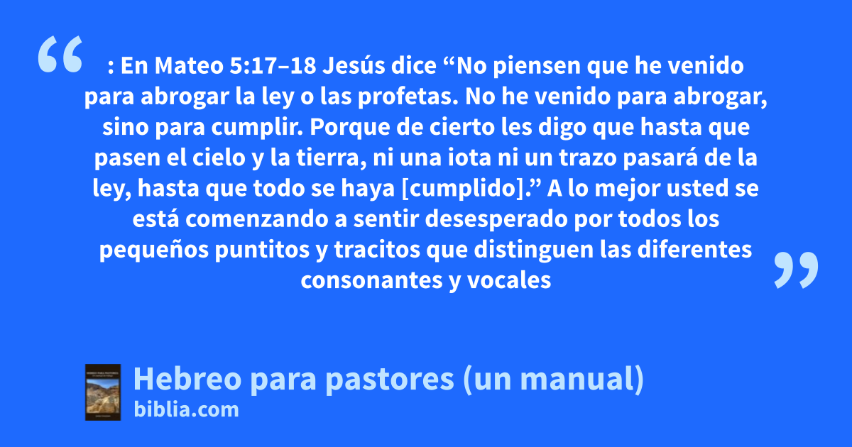 Este libro es una ayuda para ser utilizado junto con el libro, HEBREO PARA PASTORES, por Josías Grauman. Más que todo, este manual le servirá para recordarle por qué está aprendiendo hebreo. Al inicio, cuando está memorizando muchas palabras y cuadros, es fácil perderse en los detalles y olvidar el objetivo de todo. Con esto en mente, este libro únicamente tiene versículos bíblicos para traducir...