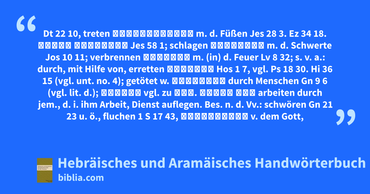 Dt 22 10, treten בְּרַגְלַיִם m. d. Füßen Jes 28 3. Ez 34 18. קְרָא בְגָרוֹן Jes 58 1; schlagen בְּהֶרֶב m. d. Schwerte Jos 10 11; verbrennen בָּאֵשׁ m. (in) d. Feuer Lv 8 32; s. v. a.: durch, mit Hilfe von, erretten בְּיהוה Hos 1 7, vgl. Ps 18 30. Hi 36 15 (vgl. unt. no. 4); getötet w. בָּאָדָם durch Menschen Gn 9 6 (vgl. lit. d.); בְּיַד vgl. zu יָד. עָבַד בְּ arbeiten durch jem., d. i. ihm Arbeit, Dienst auflegen. Bes. n. d. Vv.: schwören Gn 21 23 u. ö., fluchen 1 S 17 43, הִתְנַבֵּא v. dem Gott,