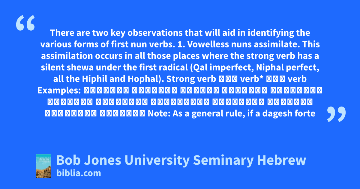 There are two key observations that will aid in identifying the various forms of first nun verbs. 1. Vowelless nuns assimilate. This assimilation occurs in all those places where the strong verb has a silent shewa under the first radical (Qal imperfect, Niphal perfect, all the Hiphil and Hophal). Strong verb פ״ן verb* פ״ן verb Examples: יִקְטֹל יִנְפֹל יִפֹּל נִקְטַל נִנְגַשׁ נִגַּשׁ יַקְטִיל יַנְגִישׁ יַגִּישׁ הָקְטַל הָנְגַשׁ הֻגַּשׁ Note: As a general rule, if a dagesh forte