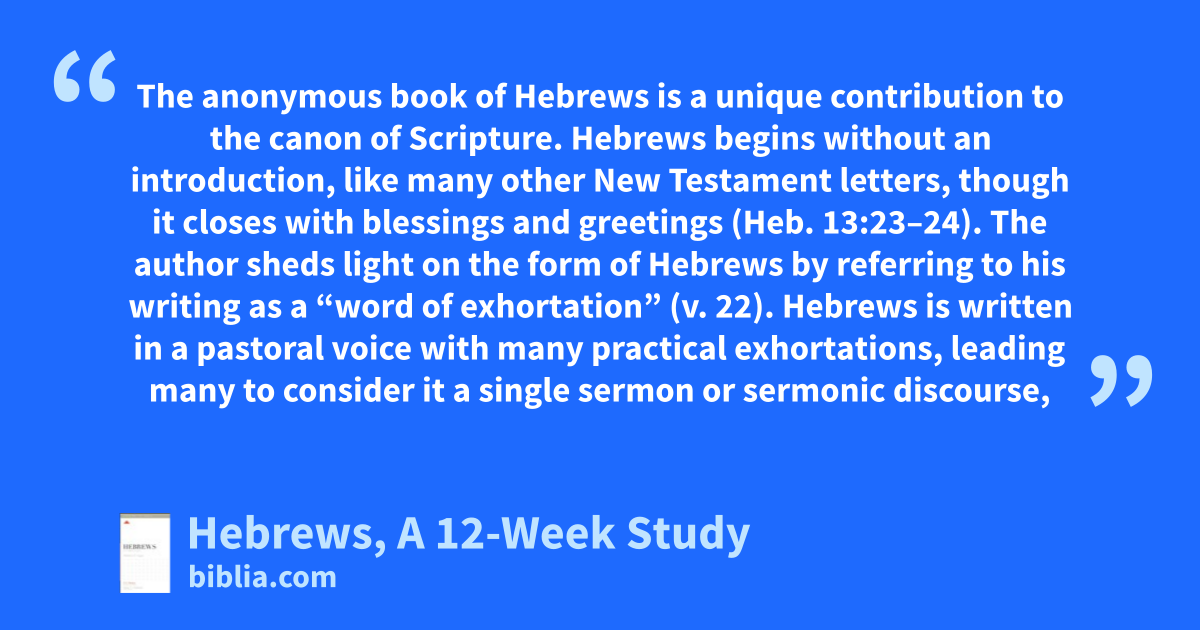 The anonymous book of Hebrews is a unique contribution to the canon of Scripture. Hebrews begins without an introduction, like many other New Testament letters, though it closes with blessings and greetings (Heb. 13:23–24). The author sheds light on the form of Hebrews by referring to his writing as a “word of exhortation” (v. 22). Hebrews is written in a pastoral voice with many practical exhortations, leading many to consider it a single sermon or sermonic discourse,
