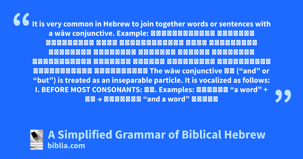 It is very common in Hebrew to join together words or sentences with a wāw conjunctive. Example: בְּרֵאשִׁ֖ית בָּרָ֣א אֱלֹהִ֑ים אֵ֥ת הַשָּׁמַ֖יִם אֵ֥ת הָאָֽרֶע׃ הָאָ֗רֶע הָיְתָ֥ה תֹ֨הוּ֙ בֹ֔הוּ חֹ֖שֶׁךְ עַל־פְּנֵ֣י תְה֑וֹם ר֣וּחַ אֱלֹהִ֔ים מְרַחֶ֖פֶת עַל־פְּנֵ֥י הַמָּֽיִם׃ The wāw conjunctive וְ (“and” or “but”) is treated as an inseparable particle. It is vocalized as follows: I. BEFORE MOST CONSONANTS: וְ. Examples: דָּבָר “a word” + וְ → וְדָבָר “and a word” אָדָם