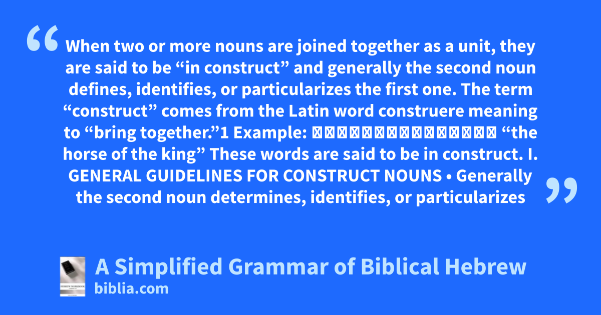 When two or more nouns are joined together as a unit, they are said to be “in construct” and generally the second noun defines, identifies, or particularizes the first one. The term “construct” comes from the Latin word construere meaning to “bring together.”1 Example: סוּס־הַמֶּ֣לֶךְ “the horse of the king” These words are said to be in construct. I. GENERAL GUIDELINES FOR CONSTRUCT NOUNS • Generally the second noun determines, identifies, or particularizes