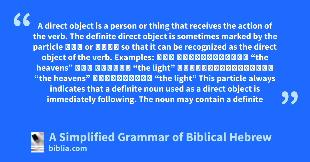 A direct object is a person or thing that receives the action of the verb. The definite direct object is sometimes marked by the particle אֵת or אֶת־ so that it can be recognized as the direct object of the verb. Examples: אֵת הַשָּׁמַ֣יִם “the heavens” אֵת הָאוֹר “the light” אֶת־הַשָּׁמַ֣יִם “the heavens” אֶת־הָאוֹר “the light” This particle always indicates that a definite noun used as a direct object is immediately following. The noun may contain a definite