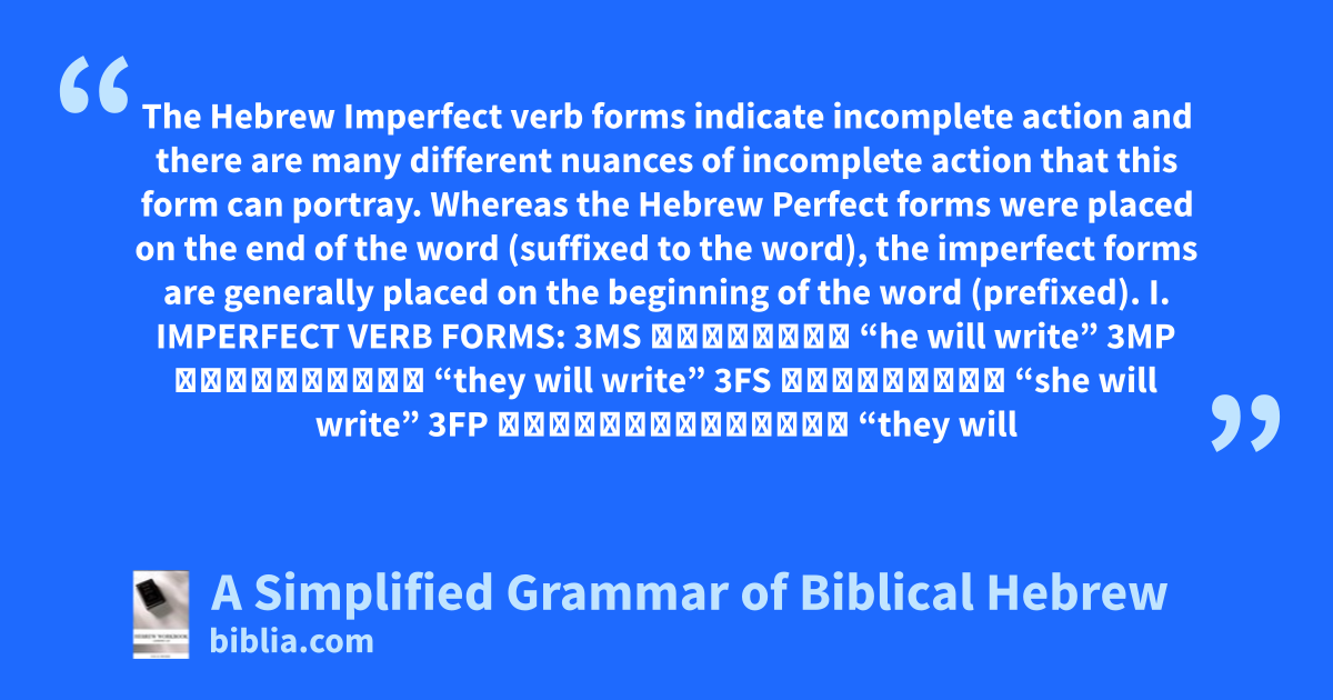 The Hebrew Imperfect verb forms indicate incomplete action and there are many different nuances of incomplete action that this form can portray. Whereas the Hebrew Perfect forms were placed on the end of the word (suffixed to the word), the imperfect forms are generally placed on the beginning of the word (prefixed). I. IMPERFECT VERB FORMS: 3MS יִכְתֹּב “he will write” 3MP יִכְתְּבוּ “they will write” 3FS תִּכְתֹּב “she will write” 3FP תִּכְתֹּ֣בְנָה “they will