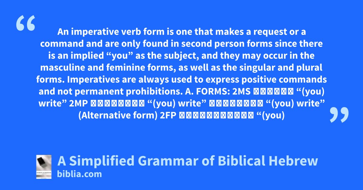 An imperative verb form is one that makes a request or a command and are only found in second person forms since there is an implied “you” as the subject, and they may occur in the masculine and feminine forms, as well as the singular and plural forms. Imperatives are always used to express positive commands and not permanent prohibitions. A. FORMS: 2MS כָּתַב “(you) write” 2MP כִּתְבוּ “(you) write” כָּתְבָה “(you) write” (Alternative form) 2FP כְּתֹ֣בְנָה “(you)