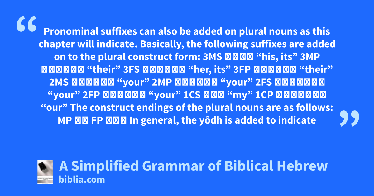 Pronominal suffixes can also be added on plural nouns as this chapter will indicate. Basically, the following suffixes are added on to the plural construct form: 3MS ◌ָיו “his, its” 3MP ◌ֵיהֶם “their” 3FS ◌ֶ֣יהָ “her, its” 3FP ◌ֵיהֶן “their” 2MS ◌ֶ֣יךָ “your” 2MP ◌ֵיכֶם “your” 2FS ◌ַ֣יִךְ “your” 2FP ◌ֵיכֶן “your” 1CS ◌ַי “my” 1CP ◌ֵ֣ינוּ “our” The construct endings of the plural nouns are as follows: MP ֵי FP וֹת In general, the yôdh is added to indicate