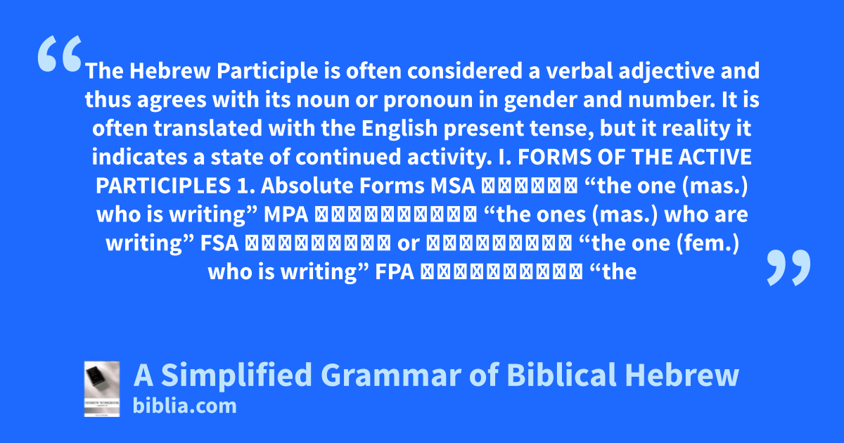 The Hebrew Participle is often considered a verbal adjective and thus agrees with its noun or pronoun in gender and number. It is often translated with the English present tense, but it reality it indicates a state of continued activity. I. FORMS OF THE ACTIVE PARTICIPLES 1. Absolute Forms MSA כֹּתֵב “the one (mas.) who is writing” MPA כֹּֽתְבִים “the ones (mas.) who are writing” FSA כֹּֽתְבָה or כֹּתֶ֣בֶת “the one (fem.) who is writing” FPA כֹּֽתְבוֹת “the