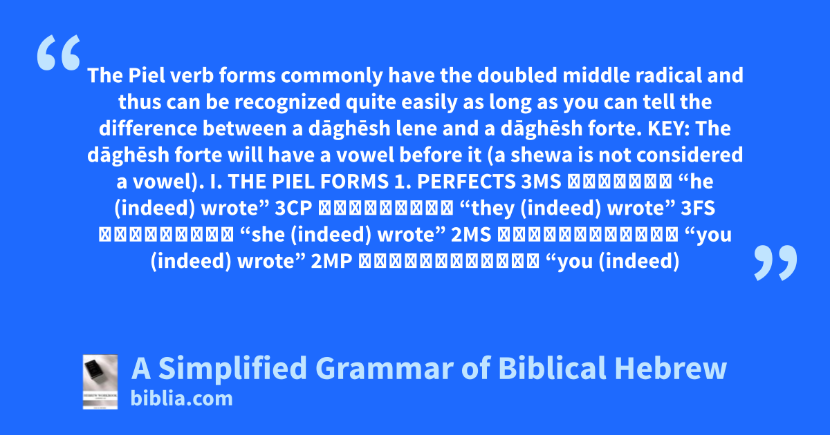 The Piel verb forms commonly have the doubled middle radical and thus can be recognized quite easily as long as you can tell the difference between a dāghēsh lene and a dāghēsh forte. KEY: The dāghēsh forte will have a vowel before it (a shewa is not considered a vowel). I. THE PIEL FORMS 1. PERFECTS 3MS כִּתֵּב “he (indeed) wrote” 3CP כִּתְּבוּ “they (indeed) wrote” 3FS כִּתְּבָה “she (indeed) wrote” 2MS כִּתַּ֣בְתָּ “you (indeed) wrote” 2MP כִּתַּבְתֶּם “you (indeed)