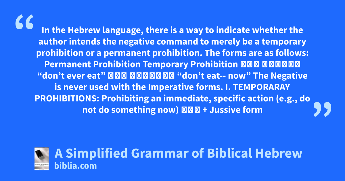 In the Hebrew language, there is a way to indicate whether the author intends the negative command to merely be a temporary prohibition or a permanent prohibition. The forms are as follows: Permanent Prohibition Temporary Prohibition לֹא תֹאכַל “don’t ever eat” אַל תֹּאכַל “don’t eat-- now” The Negative is never used with the Imperative forms. I. TEMPORARAY PROHIBITIONS: Prohibiting an immediate, specific action (e.g., do not do something now) אַל + Jussive form