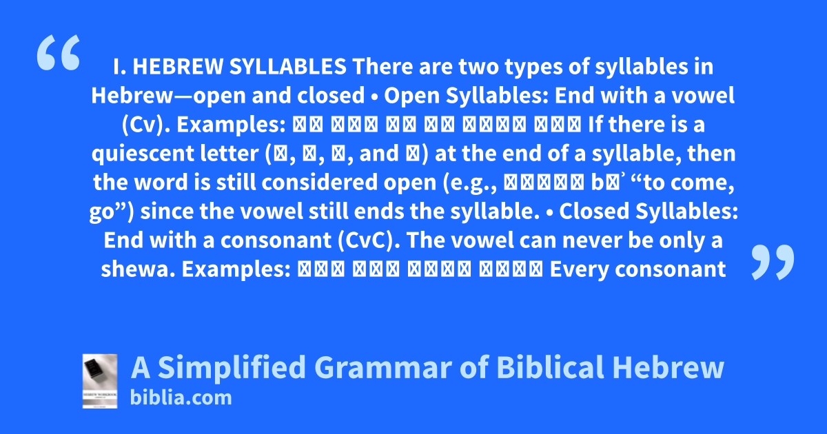 I. HEBREW SYLLABLES There are two types of syllables in Hebrew—open and closed • Open Syllables: End with a vowel (Cv). Examples: אֱ תָּ יְ וְ כִּי בְּ If there is a quiescent letter (א, ה, ו, and י) at the end of a syllable, then the word is still considered open (e.g., בּוֹא bȏʾ “to come, go”) since the vowel still ends the syllable. • Closed Syllables: End with a consonant (CvC). The vowel can never be only a shewa. Examples: אָב אֵל בֶּן בַּר Every consonant