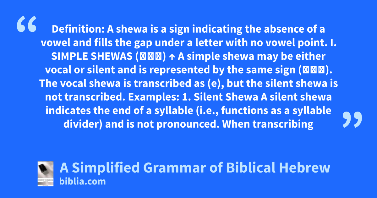 Definition: A shewa is a sign indicating the absence of a vowel and fills the gap under a letter with no vowel point. I. SIMPLE SHEWAS (כְּ) ↑ A simple shewa may be either vocal or silent and is represented by the same sign (כְּ). The vocal shewa is transcribed as (e), but the silent shewa is not transcribed. Examples: 1. Silent Shewa A silent shewa indicates the end of a syllable (i.e., functions as a syllable divider) and is not pronounced. When transcribing