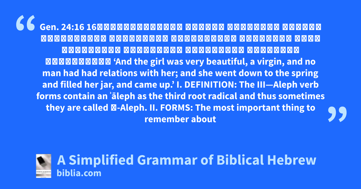 Gen. 24:16 16וְהַֽנַּעֲרָ֗ טֹבַ֤ת מַרְאֶה֙ מְאֹ֔ד בְּתוּלָ֕ה וַתֵּ֣רֶד הָעַ֔יְנָה וְאִ֖ישׁ לֹ֣א יְדָעָ֑הּ וַתֵּ֣רֶד הָעַ֔יְנָ כַדָּ֖הּ וַתָּֽעַל׃ ‘And the girl was very beautiful, a virgin, and no man had had relations with her; and she went down to the spring and filled her jar, and came up.’ I. DEFINITION: The III—Aleph verb forms contain an ʾāleph as the third root radical and thus sometimes they are called ל-Aleph. II. FORMS: The most important thing to remember about