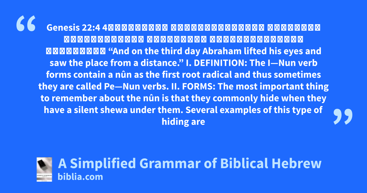Genesis 22:4 4בַּיֹּ֣ום הַשְּׁלִישִׁ֗י בְרָהָ֧ם אֶת־עֵינָ֛יו וַיַּ֥רְא אֶת־הַמָּקֹ֖ום מֵרָחֹֽק׃ “And on the third day Abraham lifted his eyes and saw the place from a distance.” I. DEFINITION: The I—Nun verb forms contain a nûn as the first root radical and thus sometimes they are called Pe—Nun verbs. II. FORMS: The most important thing to remember about the nûn is that they commonly hide when they have a silent shewa under them. Several examples of this type of hiding are