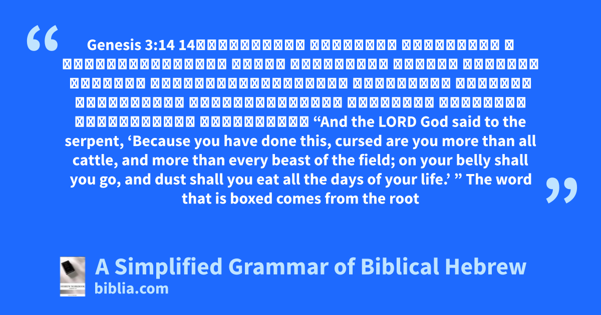 Genesis 3:14 14וַיֹּאמֶר֩ יְהוָֹ֙ה אֱלֹהִ֥ים ׀ אֶֽל־הַנָּחָשׁ֮ כִּ֣י עָשִׂ֣יתָ זֹּאת֒ אָר֤וּר אַתָּה֙ מִכָּל־הַבְּהֵמָ֔ה וּמִכֹּ֖ל חַיַּ֣ת הַשָּׂדֶ֑ה עַל־גְּחֹנְךָ֣ וְעָפָ֥ר תֹּאכַ֖ל כָּל־יְמֵ֥י חַיֶּֽיךָ׃ “And the LORD God said to the serpent, ‘Because you have done this, cursed are you more than all cattle, and more than every beast of the field; on your belly shall you go, and dust shall you eat all the days of your life.’ ” The word that is boxed comes from the root