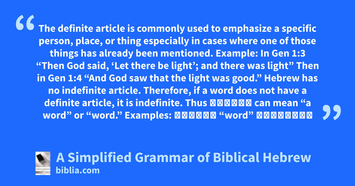 The definite article is commonly used to emphasize a specific person, place, or thing especially in cases where one of those things has already been mentioned. Example: In Gen 1:3 “Then God said, ‘Let there be light’; and there was light” Then in Gen 1:4 “And God saw that the light was good.” Hebrew has no indefinite article. Therefore, if a word does not have a definite article, it is indefinite. Thus דָּבָר can mean “a word” or “word.” Examples: דָּבָר “word” הַדָּבָר