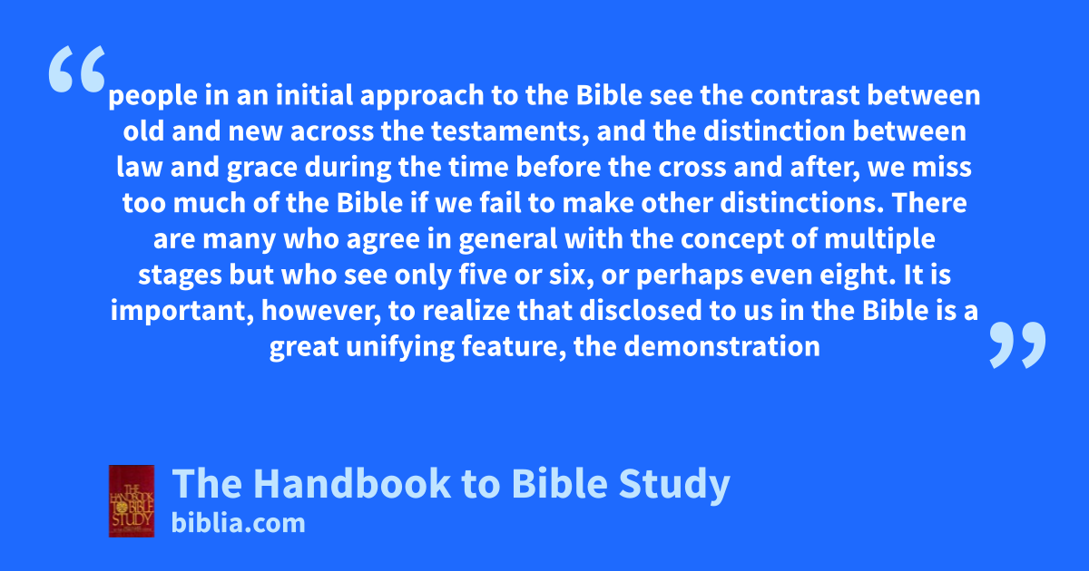 people in an initial approach to the Bible see the contrast between old and new across the testaments, and the distinction between law and grace during the time before the cross and after, we miss too much of the Bible if we fail to make other distinctions. There are many who agree in general with the concept of multiple stages but who see only five or six, or perhaps even eight. It is important, however, to realize that disclosed to us in the Bible is a great unifying feature, the demonstration