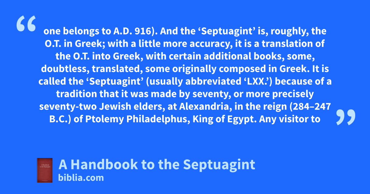 one belongs to A.D. 916). And the ‘Septuagint’ is, roughly, the O.T. in Greek; with a little more accuracy, it is a translation of the O.T. into Greek, with certain additional books, some, doubtless, translated, some originally composed in Greek. It is called the ‘Septuagint’ (usually abbreviated ‘LXX.’) because of a tradition that it was made by seventy, or more precisely seventy-two Jewish elders, at Alexandria, in the reign (284–247 B.C.) of Ptolemy Philadelphus, King of Egypt. Any visitor to