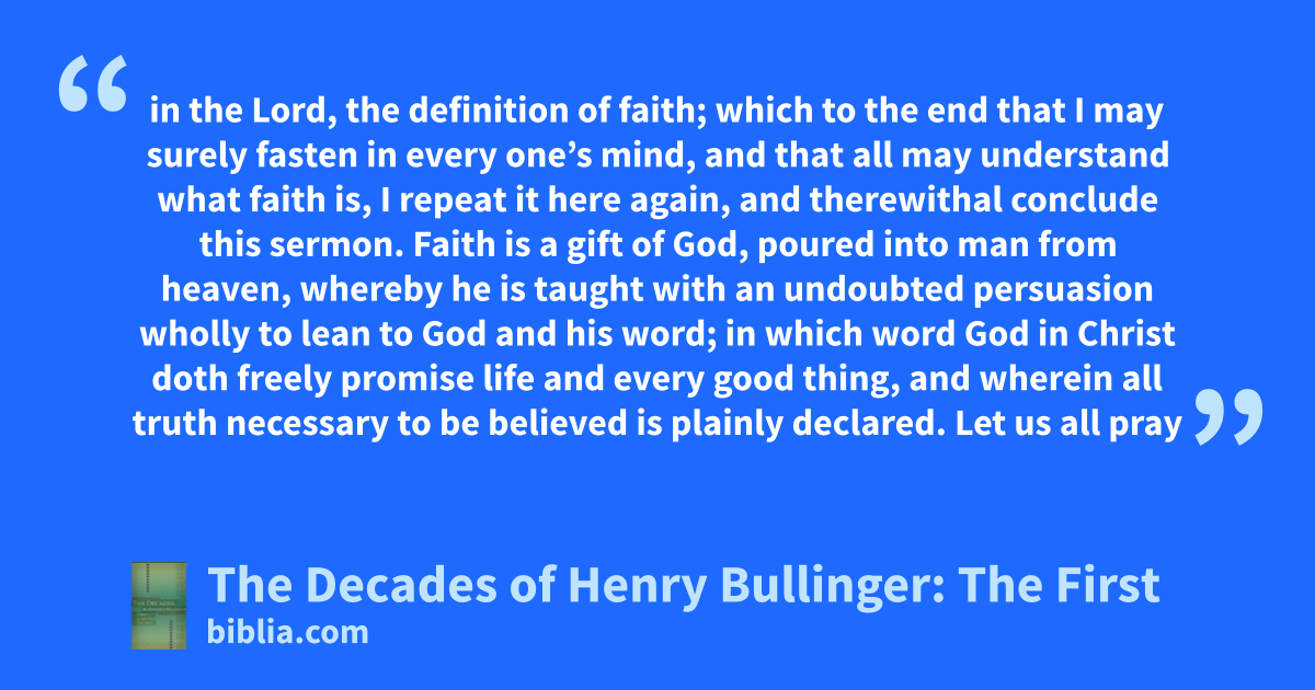 in the Lord, the definition of faith; which to the end that I may surely fasten in every one’s mind, and that all may understand what faith is, I repeat it here again, and therewithal conclude this sermon. Faith is a gift of God, poured into man from heaven, whereby he is taught with an undoubted persuasion wholly to lean to God and his word; in which word God in Christ doth freely promise life and every good thing, and wherein all truth necessary to be believed is plainly declared. Let us all pray