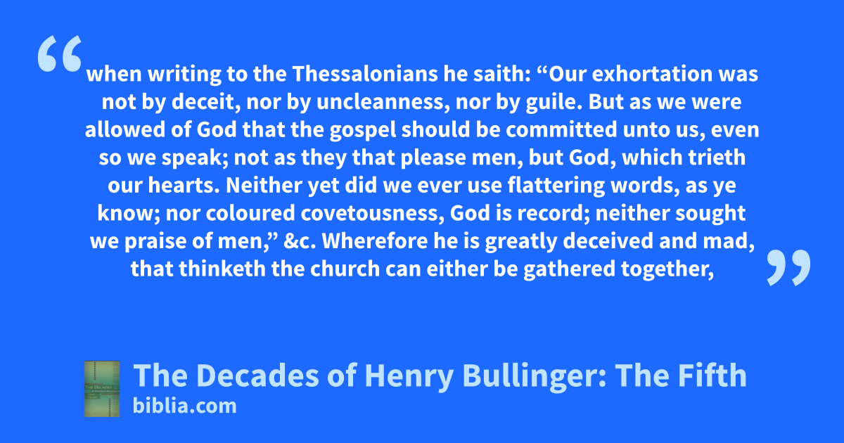 when writing to the Thessalonians he saith: “Our exhortation was not by deceit, nor by uncleanness, nor by guile. But as we were allowed of God that the gospel should be committed unto us, even so we speak; not as they that please men, but God, which trieth our hearts. Neither yet did we ever use flattering words, as ye know; nor coloured covetousness, God is record; neither sought we praise of men,” &c. Wherefore he is greatly deceived and mad, that thinketh the church can either be gathered together,