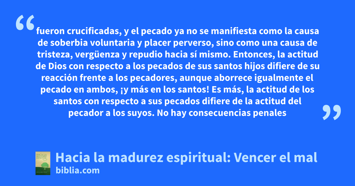 fueron crucificadas, y el pecado ya no se manifiesta como la causa de soberbia voluntaria y placer perverso, sino como una causa de tristeza, vergüenza y repudio hacia sí mismo. Entonces, la actitud de Dios con respecto a los pecados de sus santos hijos difiere de su reacción frente a los pecadores, aunque aborrece igualmente el pecado en ambos, ¡y más en los santos! Es más, la actitud de los santos con respecto a sus pecados difiere de la actitud del pecador a los suyos. No hay consecuencias penales