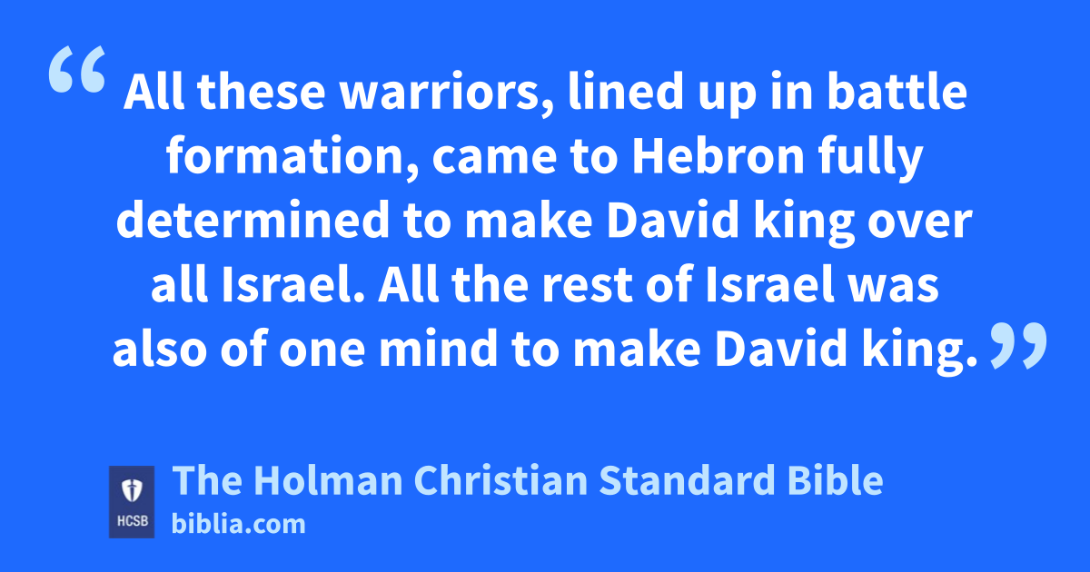 38 All these warriors, lined up in battle formation, came to Hebron fully determined to make David king over all Israel. All the rest of Israel was also of one mind to make David king. u 39 They spent three days there eating and drinking with David, for their relatives had provided for them. 40 In addition, their neighbors from as far away as Issachar, Zebulun, and Naphtali came and brought food on donkeys, camels, mules, and oxen—abundant provisions of flour, fig cakes, raisins, wine and oil, oxen, and sheep. v Indeed, there was joy in Israel.