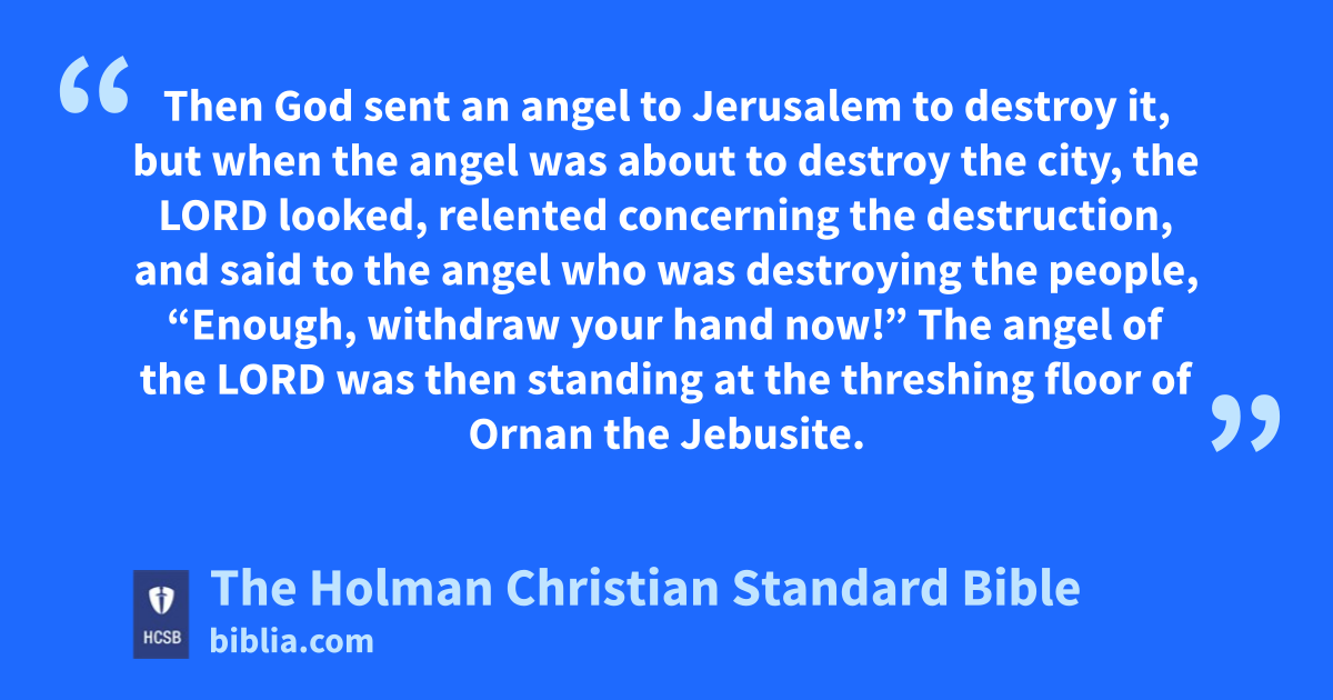 14 So the Lord sent a plague on Israel, and 70,000 Israelite men died. 15 Then God sent an angel to Jerusalem to destroy it, but when the angel was about to destroy the city, p the Lord looked, relented concerning the destruction, q and said to the angel who was destroying the people, “Enough, withdraw your hand now!” The angel of the Lord was then standing at the threshing floor of Ornan r the Jebusite.