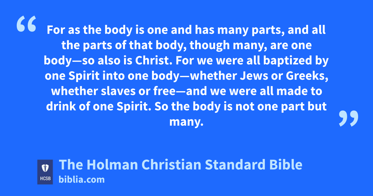 12 For as the body is one d and has many parts, and all the parts of that body, though many, are one body—so also is Christ. e 13 For we were all baptized by f one Spirit into one body—whether Jews or Greeks, whether * slaves or free—and we were all made to drink of one Spirit. g 14 So the body is not one part but many. 15 If the foot should say, “Because I’m not a hand, I don’t belong to the body,” in spite of this it still belongs to the body. 16 And if the ear should say, “Because I’m not an eye, I don’t belong to the body,” in spite of this it still belongs to the body. 17 If the whole body were an eye, where would the hearing be? If the whole body were an ear, where would the sense of smell be? 18 But now God has placed each one of the parts in one body just as He wanted. h 19 And if they were all the same part, where would the body be? 20 Now there are many parts, yet one body.