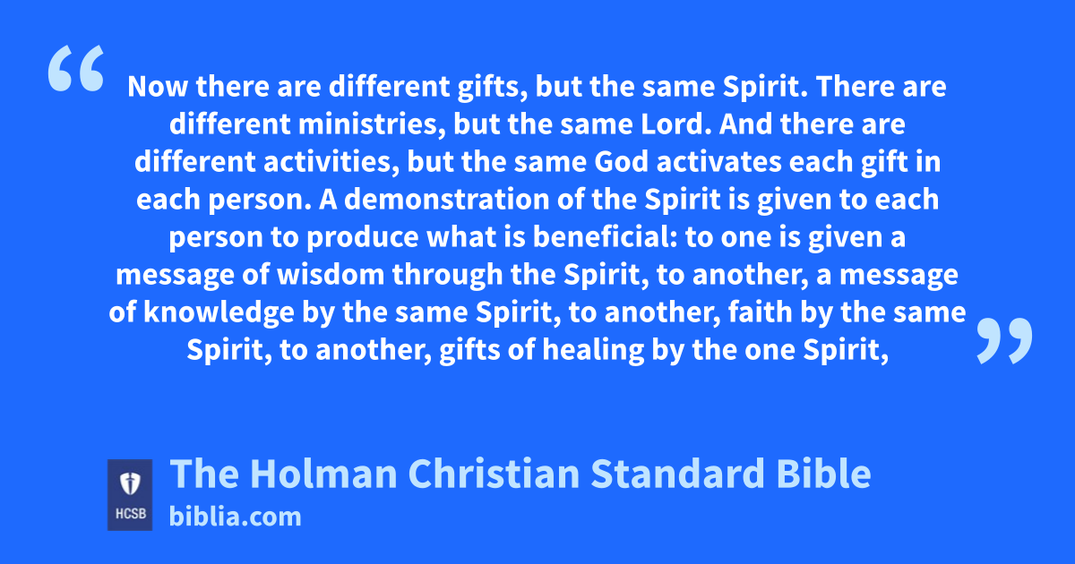 4 Now there are different gifts, u but the same Spirit. 5 There are different ministries, but the same Lord. 6 And there are different activities, but the same God activates each gift in each person. v 7 A demonstration of the Spirit is given to each person w to produce what is beneficial: