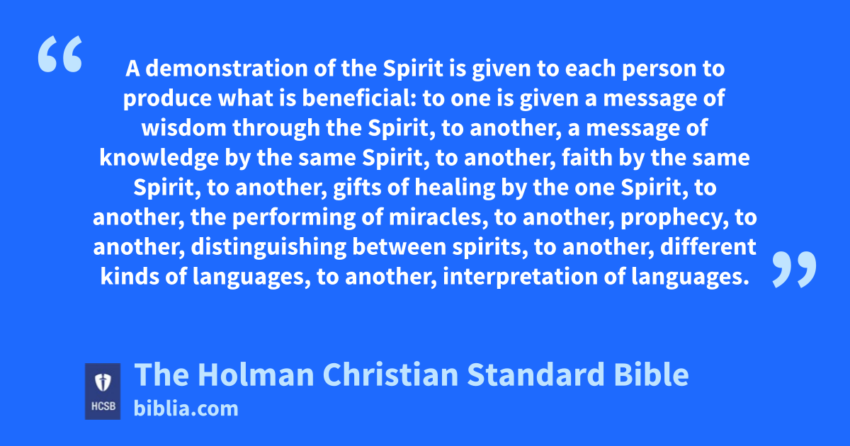 4 Now there are different gifts, u but the same Spirit. 5 There are different ministries, but the same Lord. 6 And there are different activities, but the same God activates each gift in each person. v 7 A demonstration of the Spirit is given to each person w to produce what is beneficial: