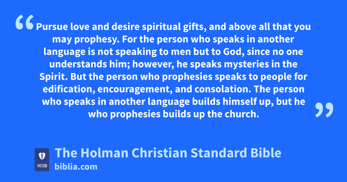 14 Pursue love and desire spiritual gifts, and above all that you may prophesy. 2 For the person who speaks in another * language k is not speaking to men but to God, since no one understands him; however, he speaks * mysteries in the Spirit. l 3 But the person who prophesies speaks to people for edification, encouragement, and consolation. 4 The person who speaks in another language builds himself up, but he who prophesies builds up the church. 5 I wish all of you spoke in other languages, but even more that you prophesied. The person who prophesies is greater than the person who speaks in languages, unless he interprets so that the church may be built up.