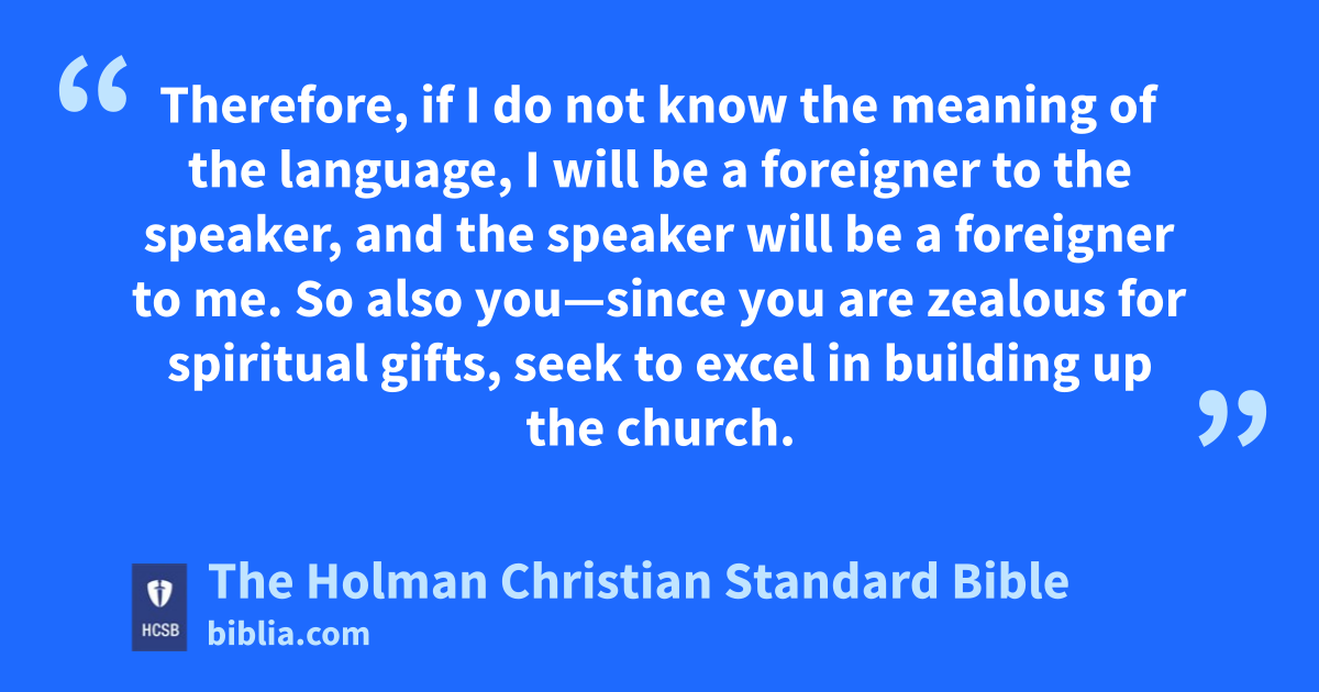 6 But now, * brothers, if I come to you speaking in other languages, how will I benefit you unless I speak to you with a revelation m or knowledge or prophecy or teaching? 7 Even inanimate things that produce sounds—whether flute or harp n—if they don’t make a distinction in the notes, how will what is played on the flute or harp be recognized? 8 In fact, if the trumpet makes an unclear sound, who will prepare for battle? o 9 In the same way, unless you use your tongue for intelligible speech, how will what is spoken be known? For you will be speaking into the air. 10 There are doubtless many different kinds of languages in the world, and all have meaning. p 11 Therefore, if I do not know the meaning of the language, I will be a foreigner q to the speaker, and the speaker will be a foreigner to me. 12 So also you—since you are zealous r for spiritual gifts, s t seek to excel in building up the church.