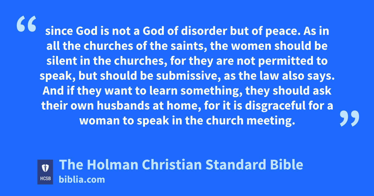 As in all the churches of the * saints, k 34 the women l should be silent in the churches, m for they are not permitted to speak, but should be submissive, as the law also says. 35 And if they want to learn something, they should ask their own husbands n at home, for it is disgraceful for a woman to speak in the church meeting. 36 Did the word of God originate from you, or did it come to you only?