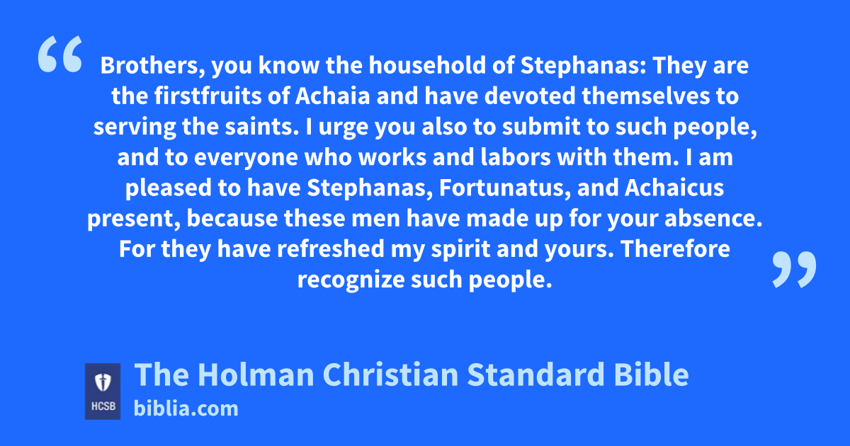 15 * Brothers, you know the household of Stephanas: They are the * firstfruits s of Achaia t and have devoted themselves to serving the saints. I urge you 16 also to submit to such people, and to everyone who works and labors with them. 17 I am pleased to have Stephanas, Fortunatus, and Achaicus present, because these men have made up for your absence. 18 For they have refreshed my spirit u and yours. Therefore recognize v such people.