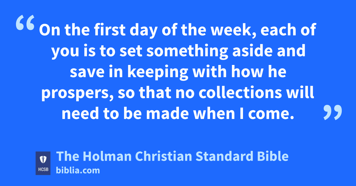 16 Now about the collection z for the * saints: You should do the same as I instructed the Galatian a churches. 2 On the first day of the week, b c each of you is to set something aside and save in keeping with how he prospers, so that no collections will need to be made when I come. d 3 When I arrive, I will send with letters e those you recommend to carry your gracious gift to Jerusalem. f 4 If it is suitable for me to go as well, they can travel with me.