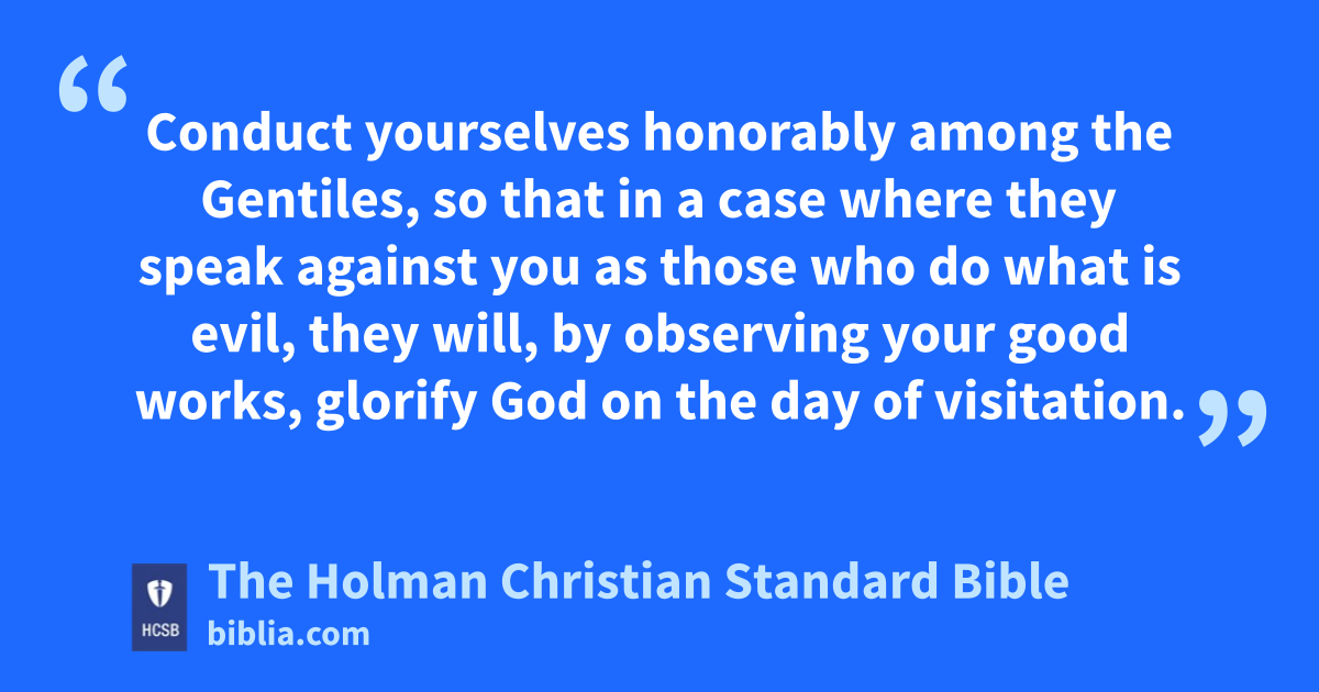 11 Dear friends, I urge you as strangers and temporary residents j to abstain k from fleshly l desires that war against you. m n 12 Conduct o yourselves honorably among the Gentiles, p so that in a case where they speak against you as those who do what is evil, they will, by observing your good works, glorify God on the day of visitation. q r