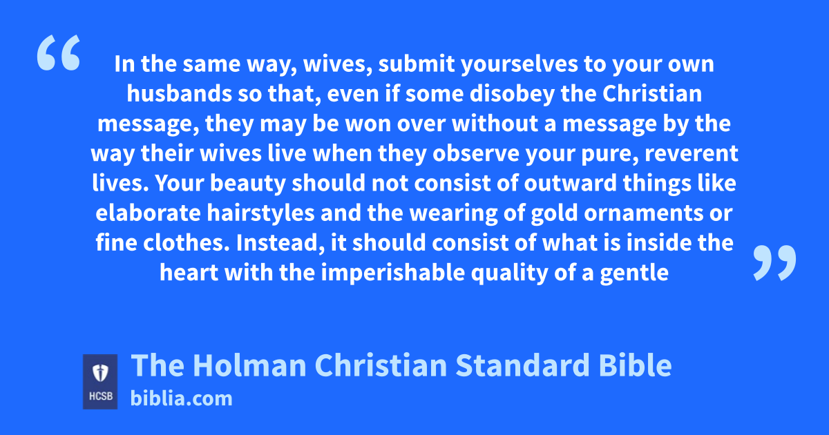 3 In the same way, wives, f submit yourselves to your own husbands so that, even if some disobey the Christian message, g they may be won over h i without a message by the way their wives live j 2 when they observe your pure, reverent lives. k 3 Your beauty should not consist of outward things like elaborate hairstyles and the wearing of gold ornaments l or fine clothes. m 4 Instead, it should consist of what is inside n the heart o with the imperishable quality of a gentle p and quiet q spirit, which is very valuable in God’s eyes. 5 For in the past, the holy r women who put their hope s in God also beautified themselves in this way, submitting to their own husbands, 6 just as Sarah t obeyed Abraham, calling him lord. You have become her children when you do what is good and are not frightened by anything alarming. u