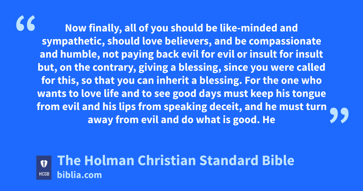 8 Now finally, all of you should be like-minded and sympathetic, should love believers, y z and be compassionate a and humble, b 9 not paying back evil for evil c or insult for insult but, on the contrary, giving a blessing, d since you were called for this, so that you can inherit a blessing.