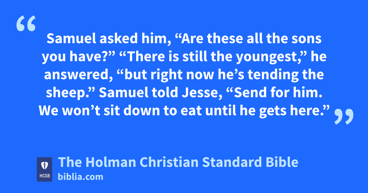 “There is still the youngest,” b he answered, “but right now he’s tending the sheep.” Samuel told Jesse, “Send for him. We won’t sit down to eat until he gets here.” 12 So Jesse sent for him. He had beautiful eyes and a healthy, c handsome appearance. d