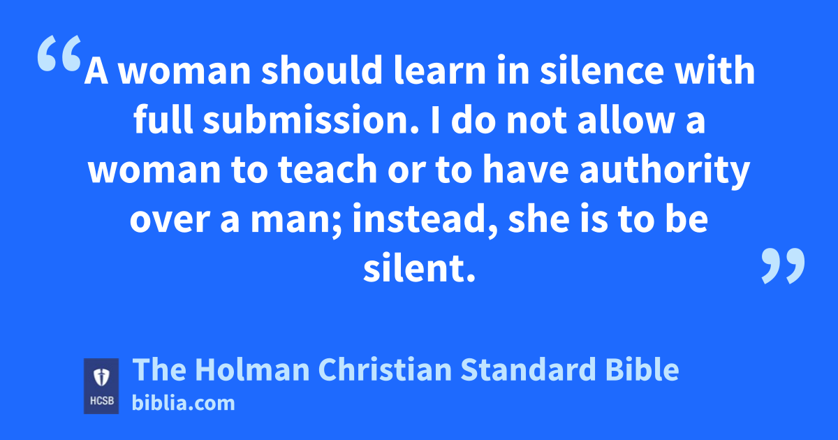 8 Therefore, I want the men in every place to pray, lifting up holy hands without anger or argument. n 9 Also, the women are to dress themselves in modest clothing, o with decency and good sense, not with elaborate hairstyles, gold, p pearls, or expensive apparel, 10 but with good works, q as is proper for women who affirm that they worship God. 11 A woman should learn in silence with full submission. r 12 I do not allow a woman to teach or to have authority over a man; instead, she is to be silent. 13 For Adam was created first, then Eve. s 14 And Adam was not deceived, but the woman was deceived and transgressed. t 15 But she will be saved through childbearing, if she continues u in faith, love, and holiness, v with good judgment.
