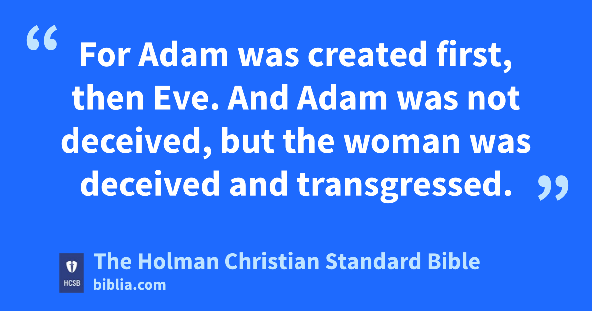 8 Therefore, I want the men in every place to pray, lifting up holy hands without anger or argument. n 9 Also, the women are to dress themselves in modest clothing, o with decency and good sense, not with elaborate hairstyles, gold, p pearls, or expensive apparel, 10 but with good works, q as is proper for women who affirm that they worship God. 11 A woman should learn in silence with full submission. r 12 I do not allow a woman to teach or to have authority over a man; instead, she is to be silent. 13 For Adam was created first, then Eve. s 14 And Adam was not deceived, but the woman was deceived and transgressed. t 15 But she will be saved through childbearing, if she continues u in faith, love, and holiness, v with good judgment.