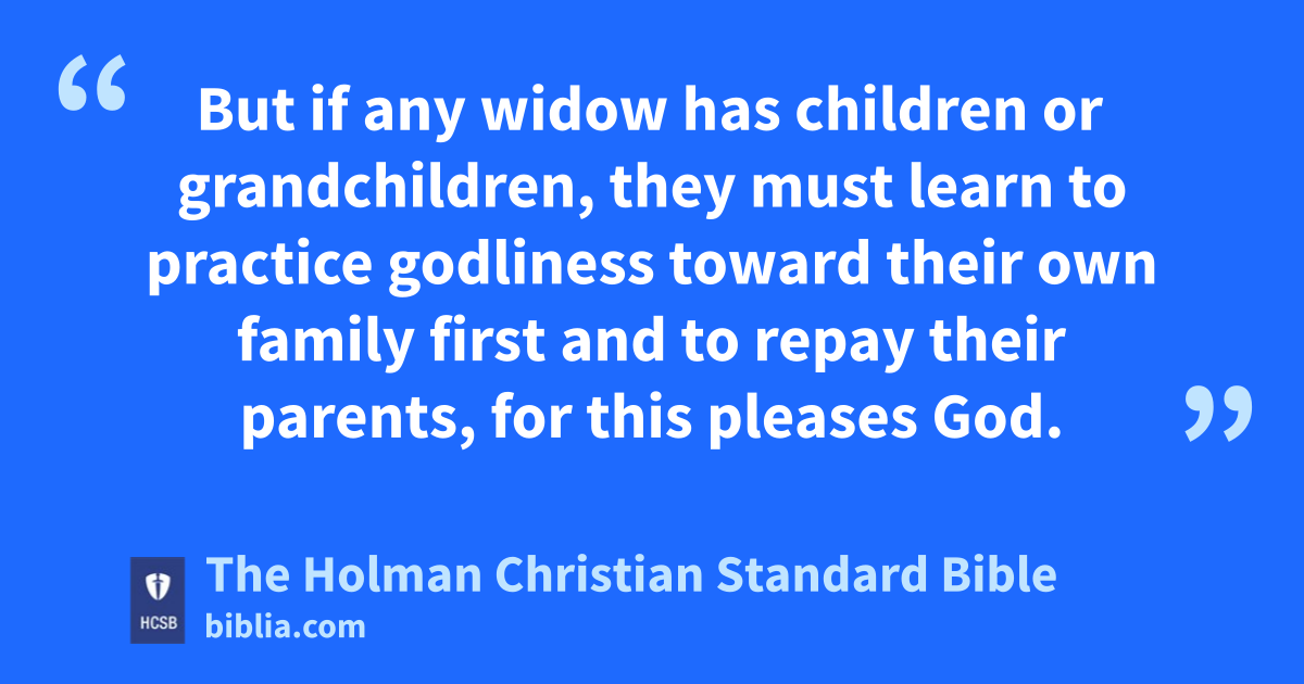 3 Support d widows e who are genuinely widows. 4 But if any widow has children or grandchildren, they must learn to practice godliness toward their own family first and to repay their parents, for this pleases God. 5 The real widow, left all alone, has put her hope in God f and continues night and day in her petitions and prayers; 6 however, she who is self-indulgent is dead even while she lives. g 7 Command this also, so they won’t be blamed. 8 But if anyone does not provide h for his own, that is his own household, he has denied the faith i and is worse than an unbeliever.