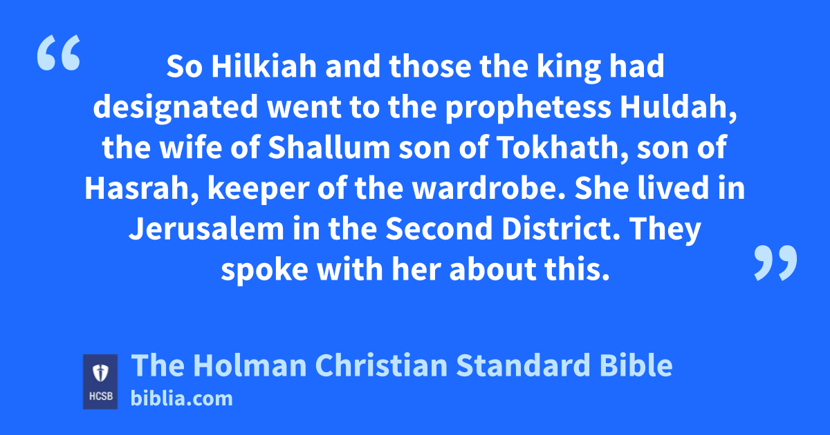 22 So Hilkiah and those the king had designated k went to the prophetess Huldah, the wife of Shallum son of Tokhath, son of Hasrah, keeper of the wardrobe. She lived in Jerusalem in the Second District. They spoke with her about this.