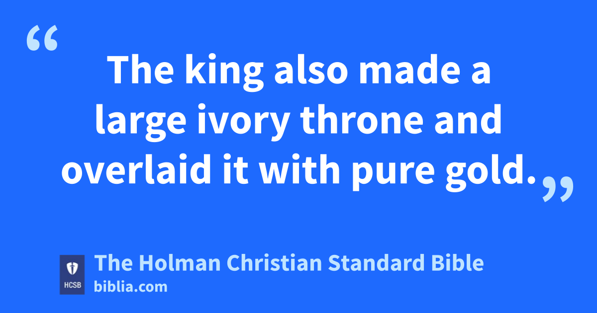 17 The king also made a large ivory throne and overlaid it with pure gold. 18 The throne had six steps; there was a footstool covered in gold for the throne, armrests on either side of the seat, and two lions standing beside the armrests. 19 Twelve lions were standing there on the six steps, one at each end. Nothing like it had ever been made in any other kingdom.